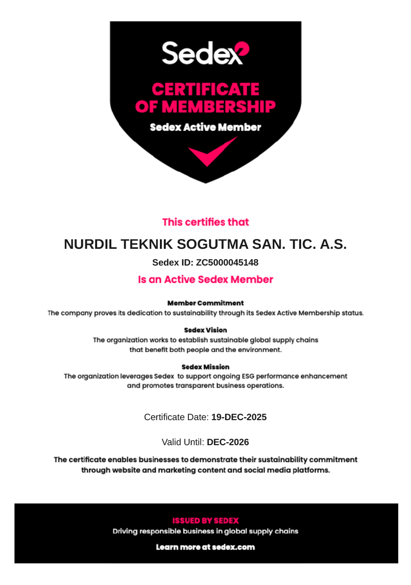 Nurdil, aktif bir Sedex Üyesidir (Sedex ID: ZC5000045148). Bu üyelik; sorumlu iş uygulamaları, etik tedarik anlayışı ve şeffaf tedarik zinciri yönetimine olan bağlılığımızı yansıtmaktadır.